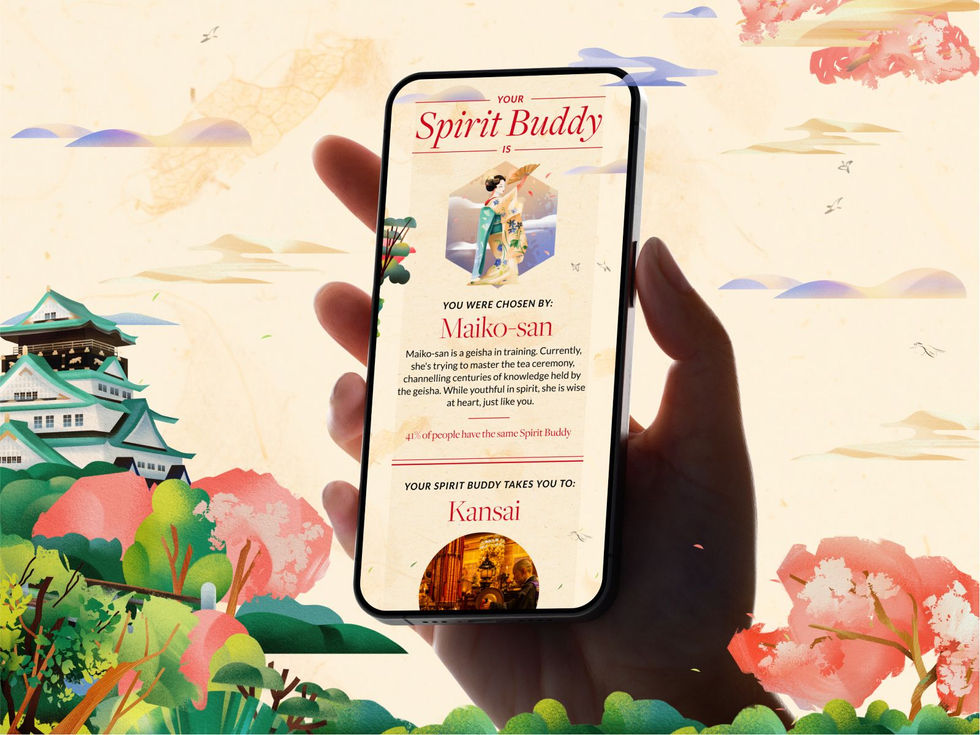 We adopted a personality-driven approach, drawing inspiration from trends like personality tests and horoscopes. By leading with an understanding of Asian cultures and interests, we created a quiz featuring iconic and fictional Japanese characters, pairing users with "spirit buddies" representing different regions. This gave people a memorable connection to each destination while encouraging quick sharing on social media.
